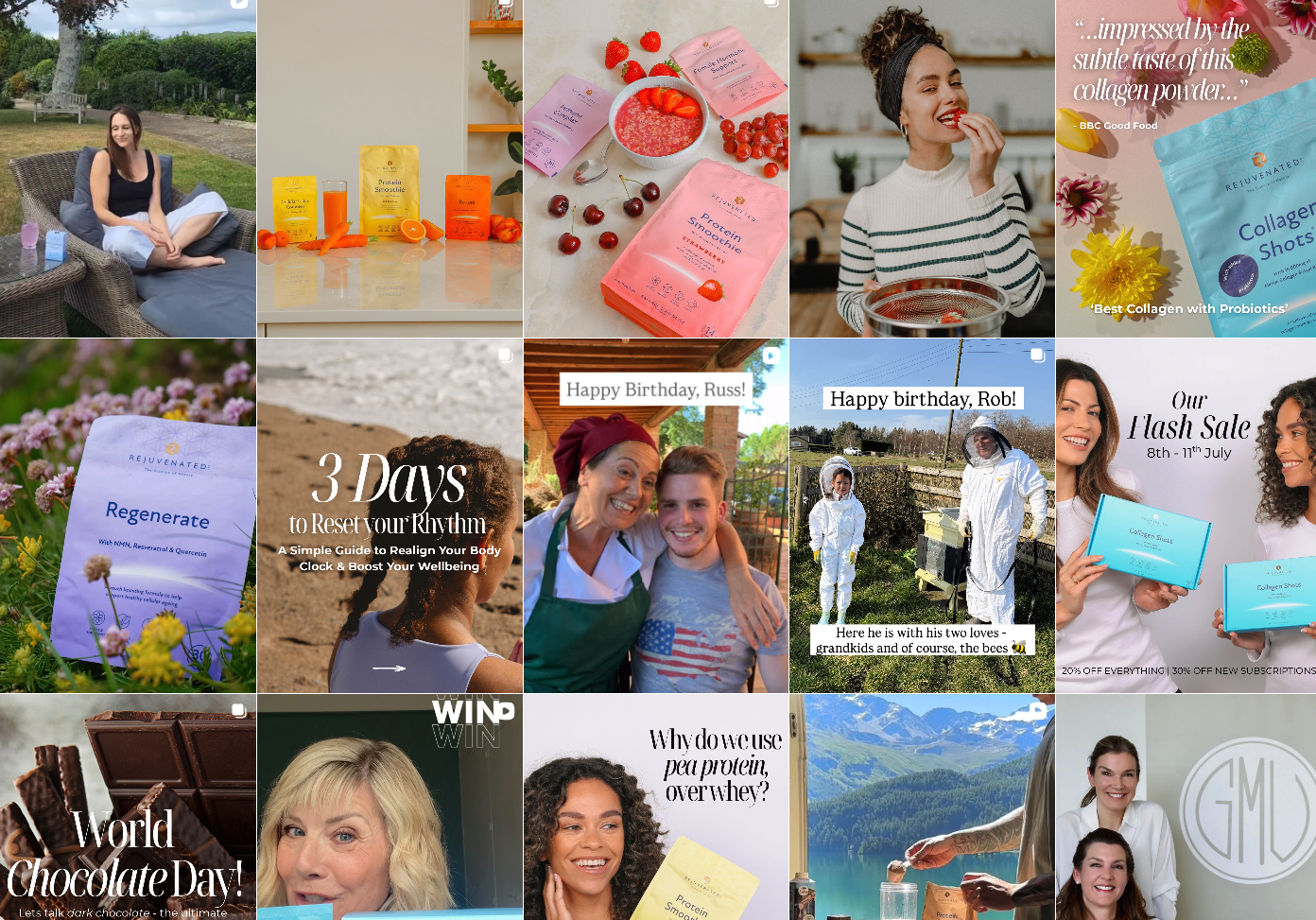 New tone and content direction was rolled out across social, journal and e-commerce. Films, instructions for social content, recipes, seasonal calendars and features across digital captured these transformations while maintaining the clinical credibility that differentiates Rejuvenated in a market of empty promises. The imperative was authenticity at every touchpoint. Real people, real moments, real results. Not models in studios but inventive, reactive marketing ideas that make the most of customer journeys and celebrity fans using Rejuvenated products and living their lives with the brand as a wellness partner.